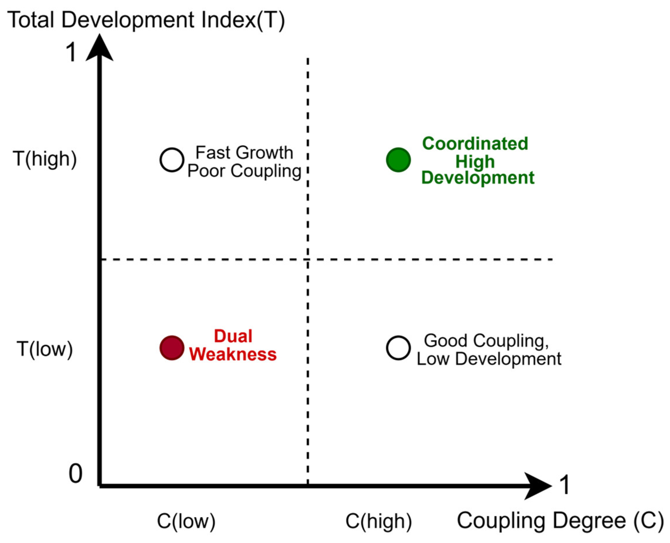 - Low C and low T: Weak coordination and unbalanced coupling.