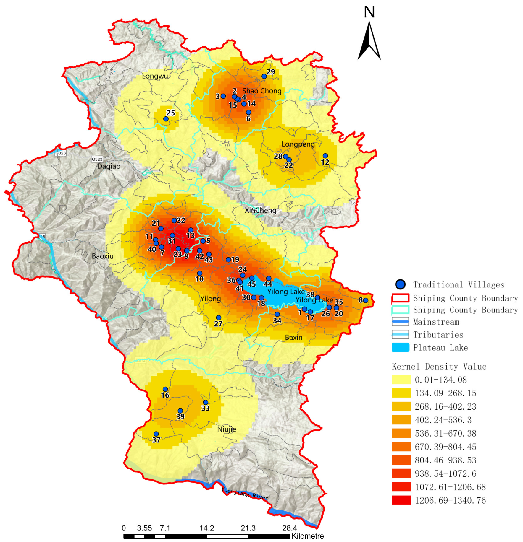 - Li, Y.F.; Hong, J.H.; Niu, F.C. Spatial distribution and influencing factors of traditional villages based on density field hot spot detection model—A case study in Southwest China. J. Southwest Univ. Nat. Sci. Ed. 2024, 46, 178–187. [Google Scholar] [CrossRef]