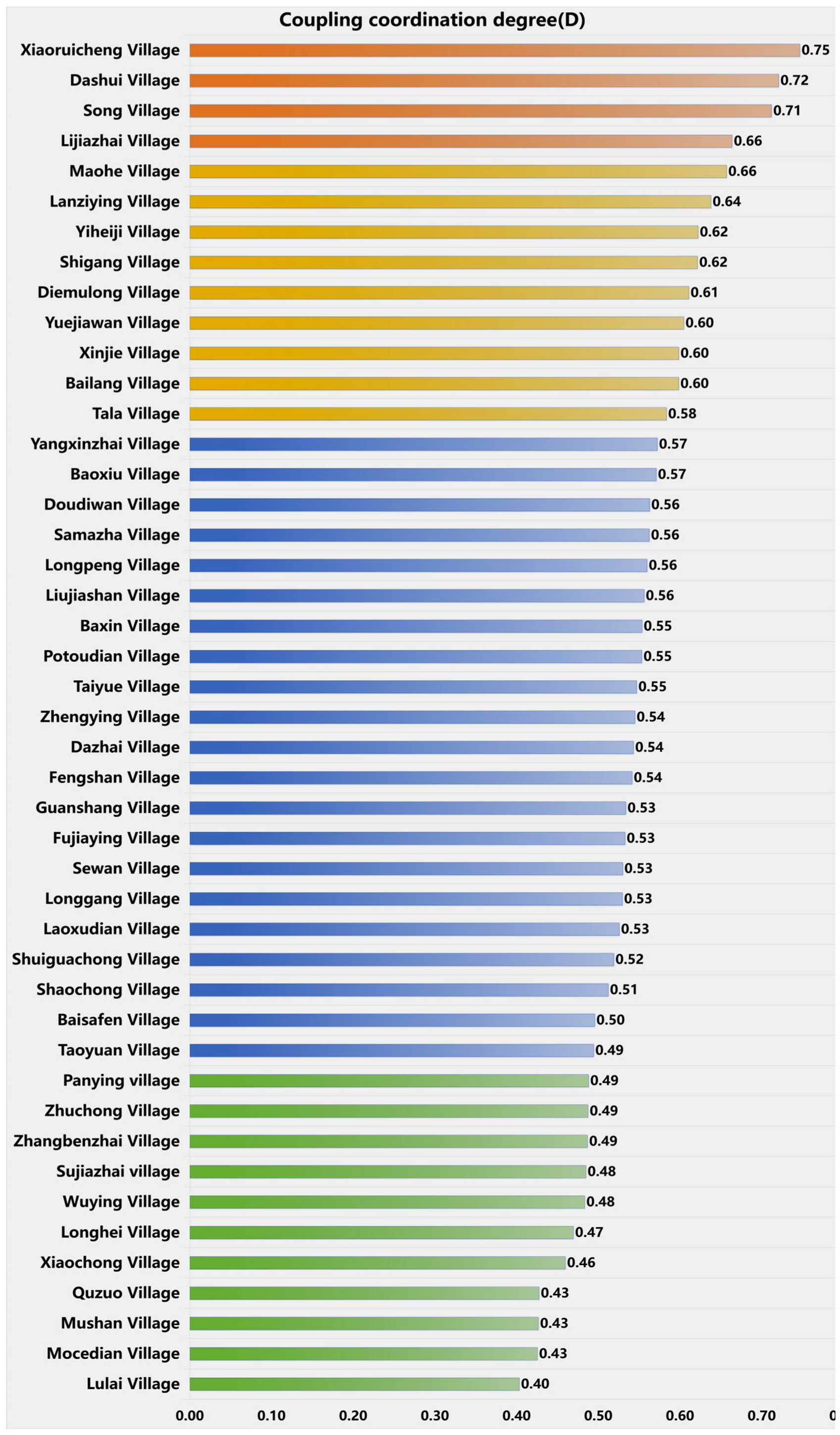 | Traditional Village Sample | Coupling Coordination Degree (D) | Value Range | Number of Villages at Different Stages |