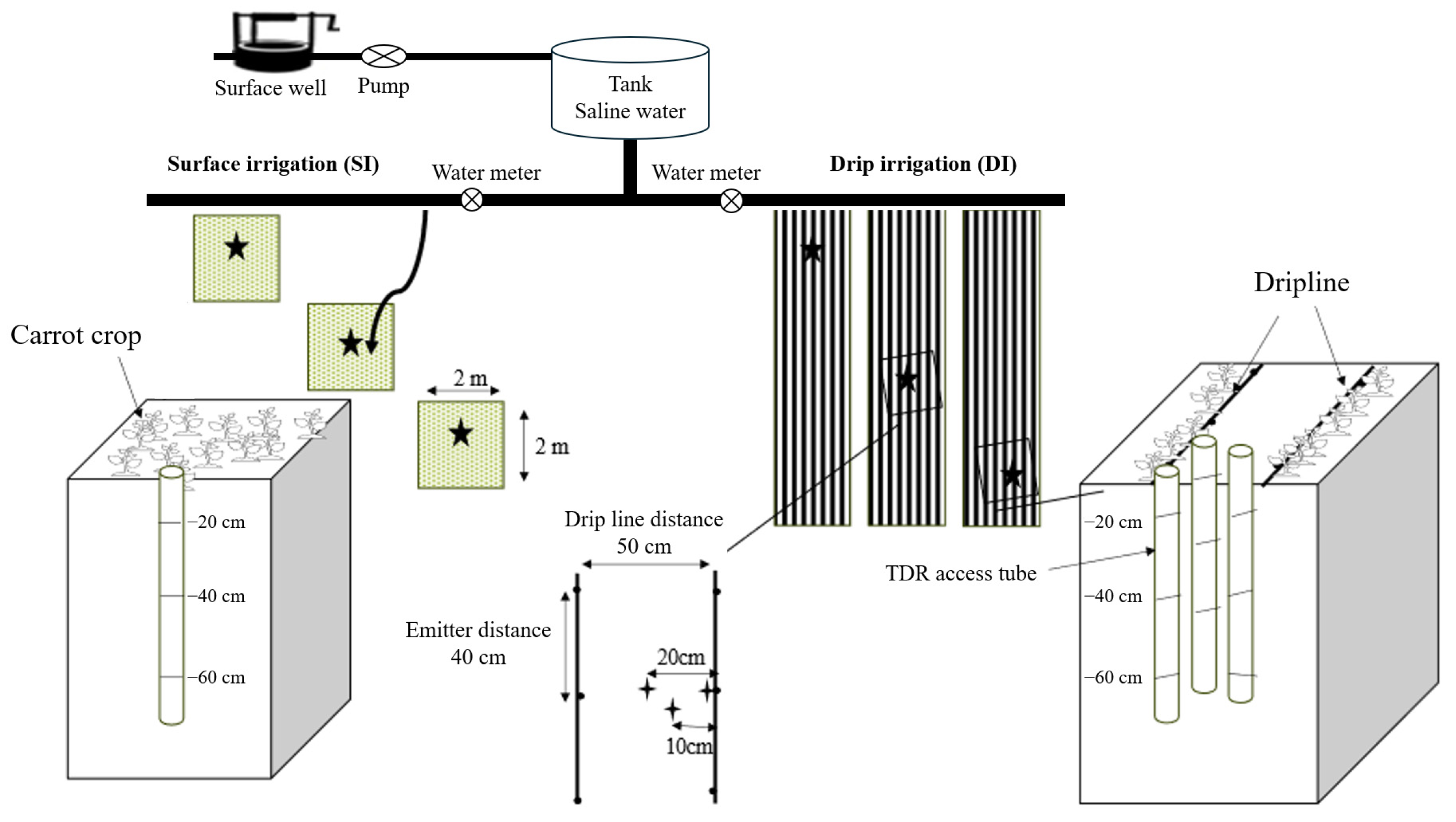 - Nagaz, K.; Masmoudi, M.M.; Mechlia, N.B. Impacts of Irrigation Regimes with Saline Water on Carrot Productivity and Soil Salinity. J. Saudi Soc. Agric. Sci. 2012, 11, 19–27. [Google Scholar] [CrossRef]