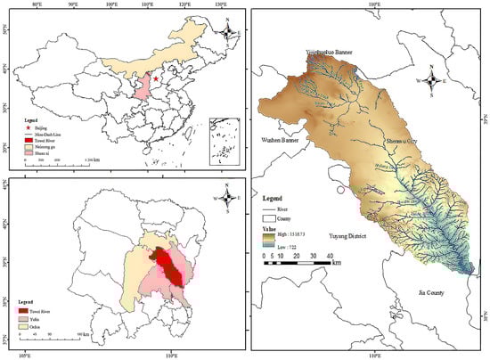 Overview of the Tuwei River Watershed. The administrative regions involved in the watershed and the surrounding administrative counties are as follows: Shaanxi Province: Shenmu city, Yuyang District, and Jia County; Inner; and the Mongolia Autonomous Region: Yijinhuoluo Banner and Wushen Banner.