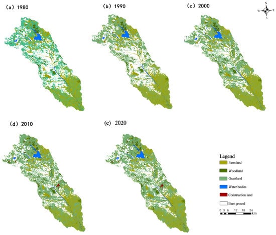 Spatiotemporal dynamics of land use and land cover (LULC) in the Tuwei River Watershed from 1980 to 2020. (a) 1980; (b) 1990; (c) 2000; (d) 2010; (e) 2020. The data were derived from the Resource and Environment Science and Data Center (RESDC) and have a spatial resolution of 30 m.