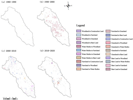 Maps of land use transfer in the Tuwei River watershed in different years calculated on the basis of the grid method. (a) 1980–1990; (b) 1990–2000; (c) 2000–2010; (d) 2010–2020. Grid size: 500 m × 500 m.