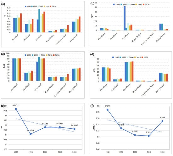 Changes in landscape indices from 1980 to 2020. Selection at the class level: (a) PD; (b) LPI; (c) ED; (d) LSI; selection at the landscape level: (e) AI; (f) SHEI.
