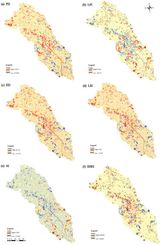 From 1980 to 2020, the landscape pattern indices in the Tuwei River watershed significantly changed (Figure 5 and Figure 6). Overall, landscape fragmentation increased, patch shapes became more complex, edge density increased, and landscape diversity decreased, indicating that the watershed landscape generally tended toward fragmentation and heterogeneity. These changes in landscape pattern indices were particularly notable in the middle and lower reaches, where anthropogenic activities were frequent. Specifically, the PD continuously increased, reflecting intensified landscape fragmentation, with areas exhibiting high-value changes progressively expanding (Figure 6a), indicating increased diversity of habitat types and increased landscape complexity within the watershed. The LPI first increased but then decreased, indicating increased landscape fragmentation, with high-value changes concentrated in the frequently disturbed middle and lower reaches, while the upper reaches maintained relatively continuous habitats (Figure 6b). Both the ED and the LSI showed sustained growth, indicating increased landscape boundaries and edge habitats, along with more complex patch shapes (Figure 6c,d). The AI initially increased but then decreased, reflecting that patch aggregation first increased but then decreased in most areas of the watershed, with high-value changes distributed mainly in the heavily disturbed middle and lower reaches (Figure 6e). The SHEI fluctuated but maintained an overall upward trend, indicating reduced landscape diversity, with particularly noticeable changes in the middle and upper reaches (Figure 6f).