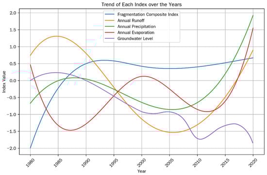 To explore the relationships between landscape fragmentation and watershed hydrological processes in the Tuwei River watershed, in this study, the dynamic characteristics of the fragmentation composite index (FCI) and four key hydrological elements (annual rainfall, annual runoff, evaporation, and groundwater level) were analyzed for 1980 to 2020 (Figure 8). The results revealed that the FCI increased overall: it remained at the lowest level in the 1980s, remained relatively stable in the 1990s, fluctuated after 2000, and increased significantly after 2010, indicating continuously intensifying landscape fragmentation in the watershed. Annual rainfall and runoff demonstrated consistent trends, with both showing noticeable increases after 2005, reflecting the coupling between enhanced precipitation and surface runoff recharge processes. Evaporation remained relatively high during the 1980s, decreased significantly in the early 2000s (2000–2005), and subsequently recovered. The groundwater level generally decreased, with the most substantial decrease occurring between 2005 and 2015, possibly related to increased groundwater extraction and reduced recharge in the watershed.
