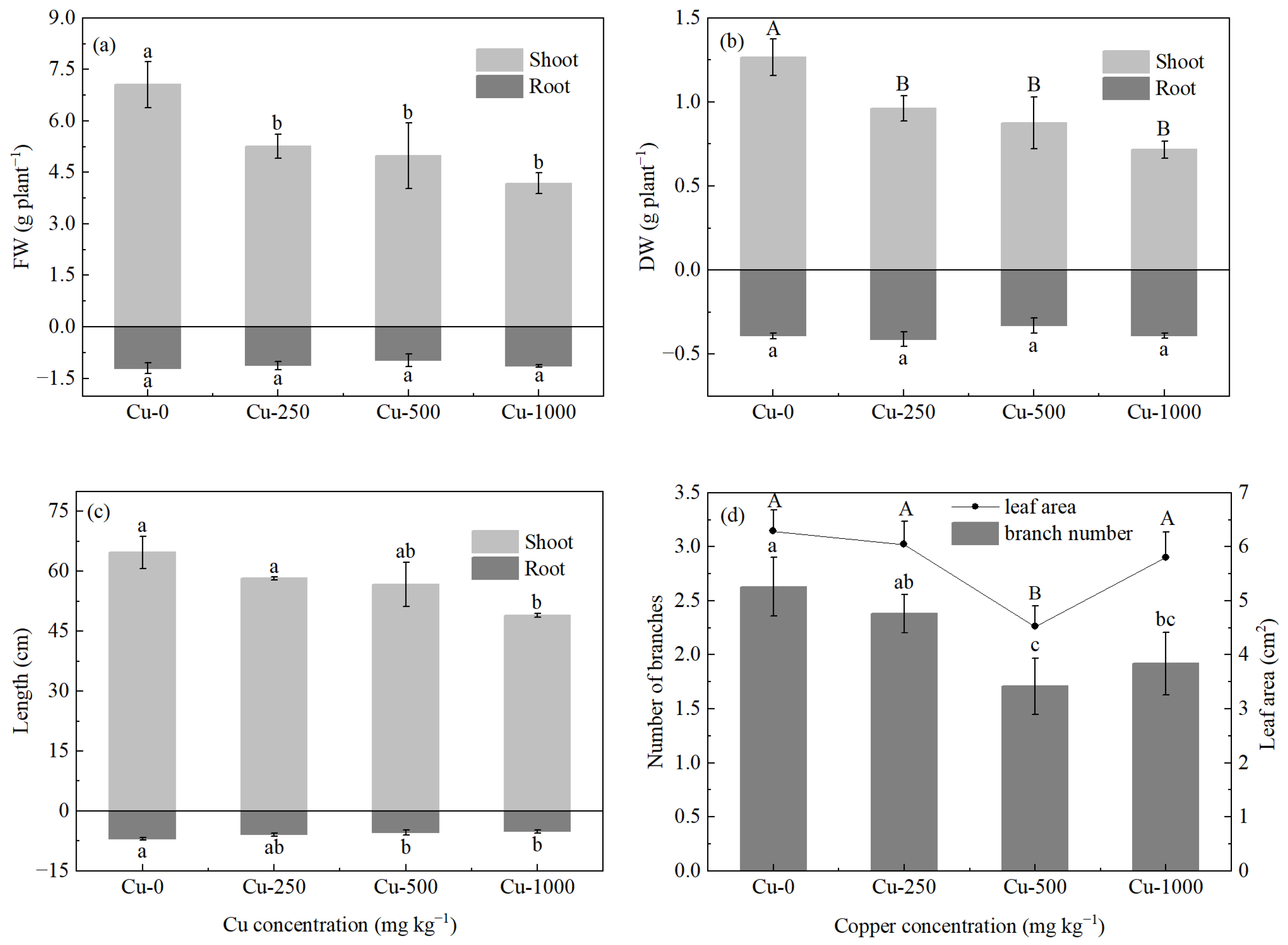 Figure 1. Effects of copper treatments on above- (shoot) and belowground (root): (a) fresh weight, (b) dry weight, (c) length, and (d) number of branches and leaf area in Alternanthera philoxeroides. Different lowercase letters indicate significant differences among different copper treatments (p < 0.05); Different capital letters indicate extremely significant differences among different copper treatments (p < 0.01).