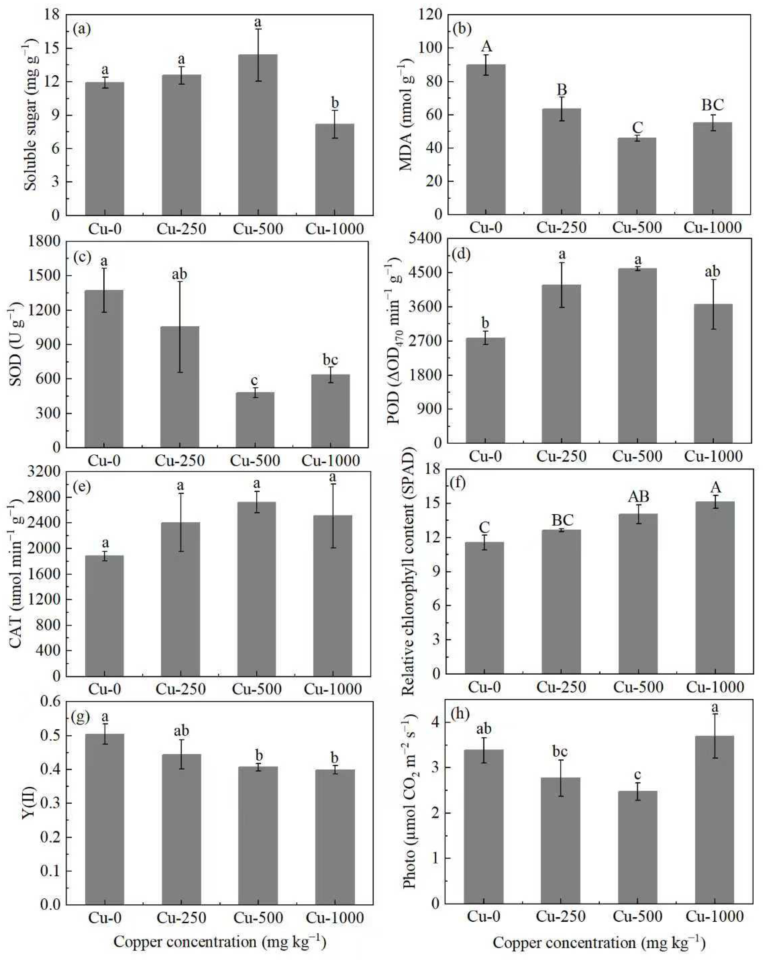 Figure 2. Effects of copper treatment on: (a) soluble sugar contents, (b) malondialdehyde contents, (c) superoxide dismutase activities, (d) peroxidase activities, (e) catalase activities; (f) relative chlorophyll contents, (g) actual quantum yield, and (h) net photosynthetic rate in Alternanthera philoxeroides. Different lowercase letters indicate significant differences among different copper treatments (p < 0.05); Different capital letters indicate extremely significant differences among different copper treatments (p < 0.01).