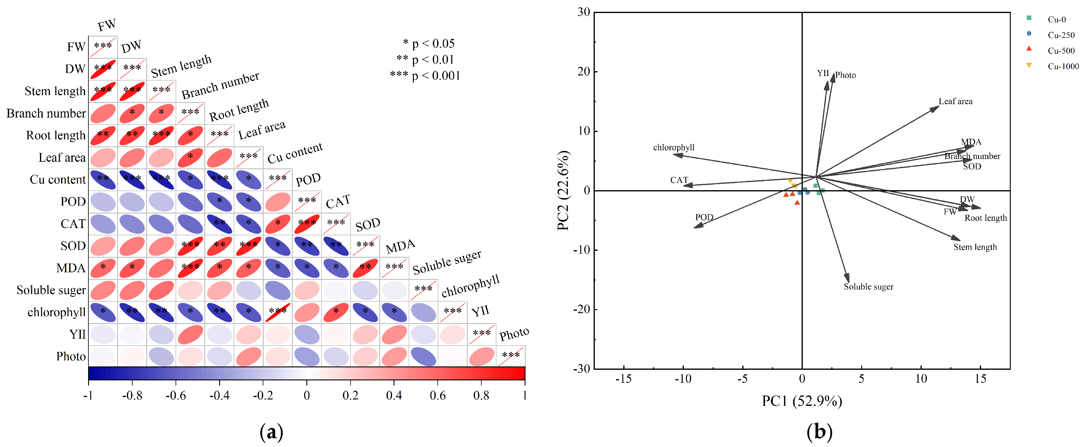 Figure 3. (a) Correlation matrix between plant growth indexes and physiological and biochemical indexes of Alternanthera philoxeroides based on Spearman’s correlation coefficients; and (b) Principal component analysis (PCA) of Cu contents in the whole plant of Alternanthera philoxeroides under Cu treatments and associated plant growth indexes and physiological and biochemical indexes. FW = fresh weight; DW = dry weight; Cu content = copper content in the whole plant; POD = Peroxidase; CAT = Catalase; SOD = Superoxide dismutase; MDA = Malondialdehyde; YII = Actual optical quantum efficiency; Photo = Net photosynthetic rate. Red and blue indicate positive and negative correlations between two factors, respectively. The size of the ellipse is inversely proportional to the correlation coefficient. The asterisk indicates statistical significance, * p < 0.05, ** p < 0.01, *** p < 0.001.
