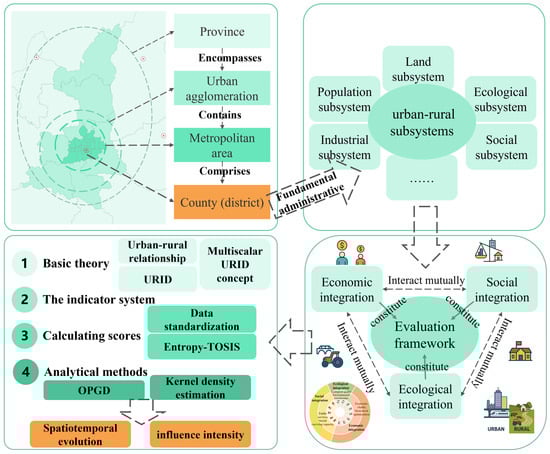 Conceptually, URID has evolved from early normative visions of urban-rural relations into a multiscale framework embedded in specific institutional and spatial contexts [33]. This subsection reviews this evolution, clarifies the connotation of URID at the county (district) scale, and summarizes the main evaluation frameworks.