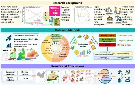 By 2010, the global urbanization rate had exceeded 50% [1]. According to World Bank Open Data, this figure reached 58% by 2024, confirming cities as the primary habitat for humanity. While rapid urbanization has propelled regional economic growth, it has also intensified regional disparities and contributed to the spatial concentration of poverty and inequality [2]. These disparities largely stem from the excessive agglomeration of resources and factors of production and from spatial differentiation during the urbanization process, which together widen the urban-rural divide [3]. Consequently, the United Nations identifies “Reduce inequality within countries” (Sustainable Development Goal 10) as a key objective for sustainable development [4]. As the largest developing country, China increased its urbanization rate from 10.6% (1949) to 67% (2024) over roughly seven decades, thereby offering valuable experience for the Global South. However, amid rapid urbanization, the intrinsic linkages between urban and rural areas as an integrated whole have, to some extent, been overlooked [5], leading to regional imbalances and insufficient rural development [6]. Thus, narrowing the urban-rural divide and achieving high-quality regional development have become central challenges in China’s ongoing economic and social transformation [7,8]. In response, the Report to the 19th National Congress of the Communist Party of China called for “establishing and improving the institutional mechanisms for urban-rural integrated development (URID),” formally elevating URID to a national strategic objective.