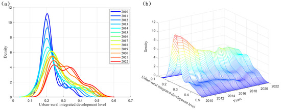 Kernel density curves of URID in the Xi’an metropolitan area from 2010 to 2022: (a) two-dimensional kernel density curve; (b) three-dimensional kernel density curve.