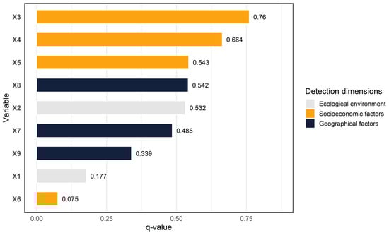 Based on the nine selected explanatory factors, the OPGD model was applied to identify the principal factors associated with URID in the Xi’an metropolitan area. As shown in Figure 6, the socioeconomic factors constituted the core explanatory dimension. Except for the rate of net migration (X6), all variables recorded q-value above 0.5, indicating strong explanatory power. The proportion of built-up area (X3) had the highest q-value (0.760), underscoring its dominant association with URID. This pattern highlights the pivotal role of land-use efficiency. An increase in the proportion of built-up area signifies more developed infrastructure and expanded space for industrial activity. It facilitates urban population agglomeration by providing housing and employment, and promotes bidirectional factor flows between urban and rural areas through the extension of transport networks, thereby improving the efficiency of resource allocation [28]. The GRP (X4) ranked second by q-value (0.664). As a direct indicator of regional economic vitality and development potential, a higher GRP reflects a more diversified industrial system and greater employment availability. It is consistent with a pattern of narrowing the urban-rural gap through the pathway of “industrial upgrading-income growth-consumption expansion” [15]. Geographical and locational factors also exerted a fundamental conditioning effect on URID. Both slope (X8) (0.542) and DEM (X7) (0.485) demonstrated relatively high q-value. The Xi’an metropolitan area features higher terrain in the north and south and a lower central plain. Flatter counties (districts) on the central plain can extend transport networks and expand built-up areas more readily, which in turn strengthens spatial interaction and factor exchange between urban and rural areas. Within the ecological environment, the output of grain crops (X2) showed a relatively high q-value (0.532), whereas the forest coverage rate (X1) exhibited a more limited influence (0.177). This pattern is closely linked to the functional division of “core consumption and peripheral production” within the metropolitan area. The central-plain counties (districts), which function as the main grain-producing zone, not only supply agricultural products to the core urban areas but also raise farmer incomes through scaled operations, thereby indirectly strengthening urban-rural economic and social linkages [55]. In contrast, the forested northern and southern mountainous areas, where development is restricted by ecological conservation policies, possess relatively homogeneous industrial structures and contribute less significantly to URID.