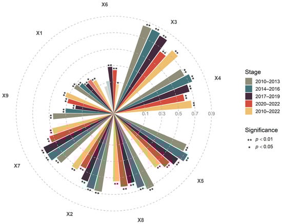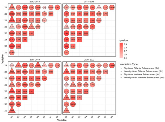 Based on the temporal evolution characteristics of URID levels, this study divided the period 2010 to 2022 into four distinct stages (2010 to 2013, 2014 to 2016, 2017 to 2019, and 2020 to 2022) to investigate the stage-specific explanatory patterns, including dominant factors and their interaction effects. As illustrated in Figure 8, the ranking of factors by their average q-value across these stages is as follows: X3 (0.783) > X4 (0.669) > X5 (0.647) > X8 (0.624) > X2 (0.589) > X7 (0.588) > X9 (0.315) > X1 (0.225) > X6 (0.156). Socioeconomic factors consistently served as the core explanatory dimension of URID in all stages, although the overall mean q-value showed a clear downward trend. The average q-value of these factors peaked during 2014 to 2016 (0.77), a period during which the Xi’an metropolitan area was in a phase of accelerated industrialization. This stage was characterized by an average annual GDP growth rate of 6.08% and an annual built-up area expansion rate of 3.36%, indicating that economic growth and land development played the most substantial role in explaining URID at that time. In 2020 to 2022, the average q-value of socioeconomic factors fell to 0.61 under the impact of COVID-19. As China entered the post-pandemic era, the q-value of traditional economic variables weakened markedly [57], indicating a shift in URID from an economy-driven stage toward multidimensional coordination.