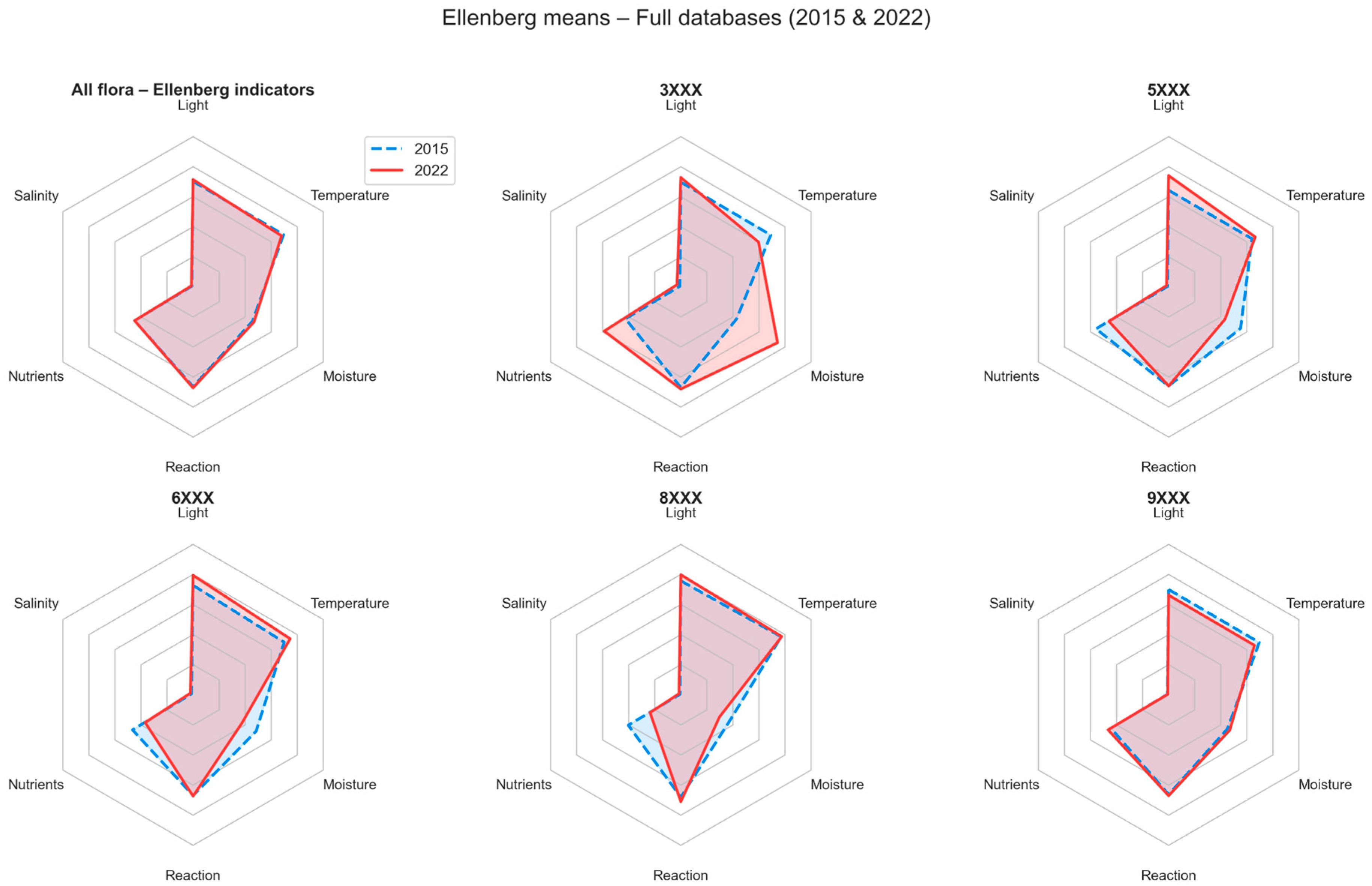 Overall, the results indicate statistically significant yet spatially differentiated shifts in the Ellenberg indicator values between 2015 and 2022, as detailed in