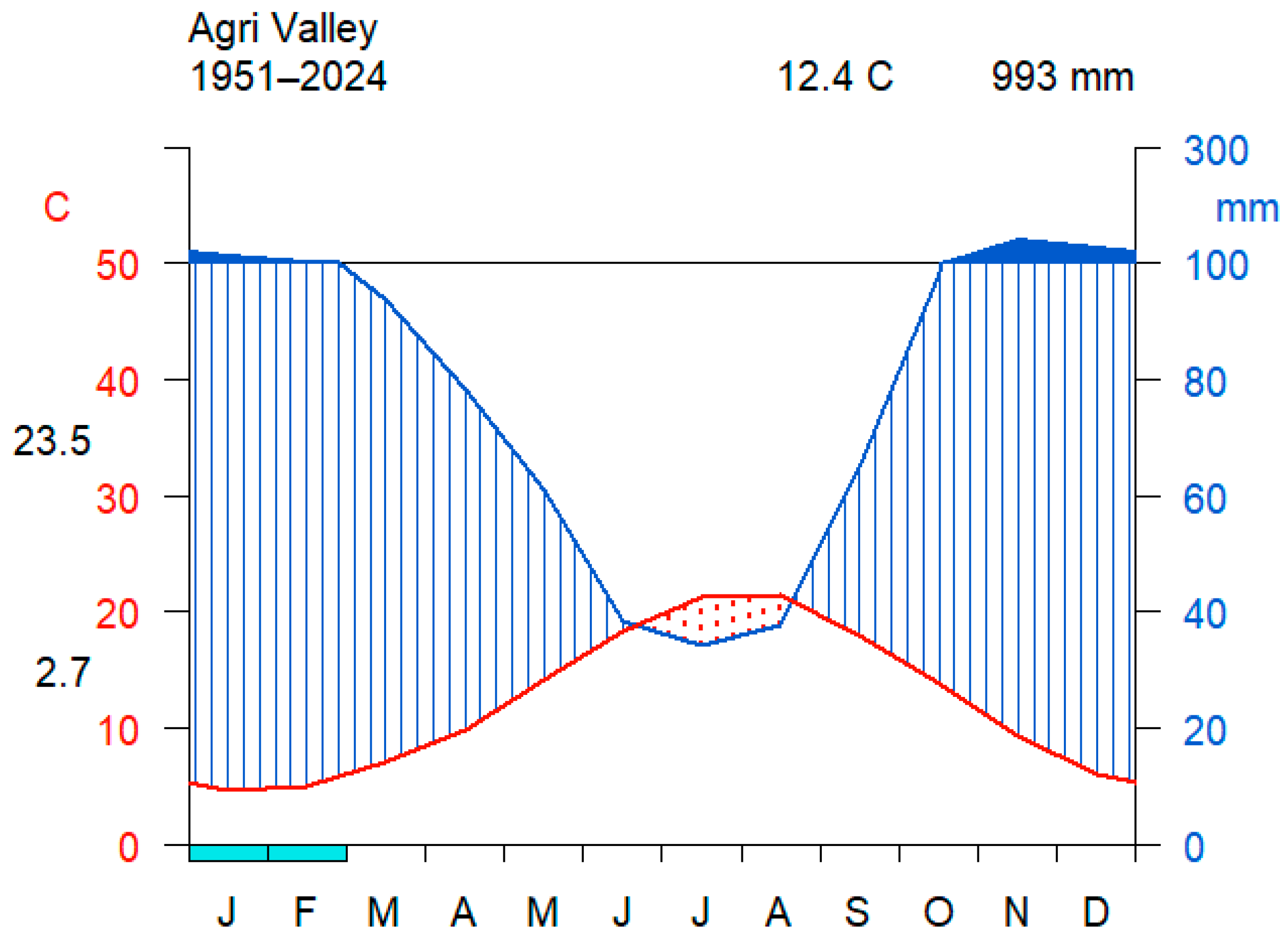 The climatic characterization of the study area, based on the BIGBANG dataset, highlights a typical Mediterranean regime with marked seasonality in both temperature and precipitation. To provide a synthetic and ecologically meaningful overview of these patterns, we adopted a Walter–Lieth climate diagram (