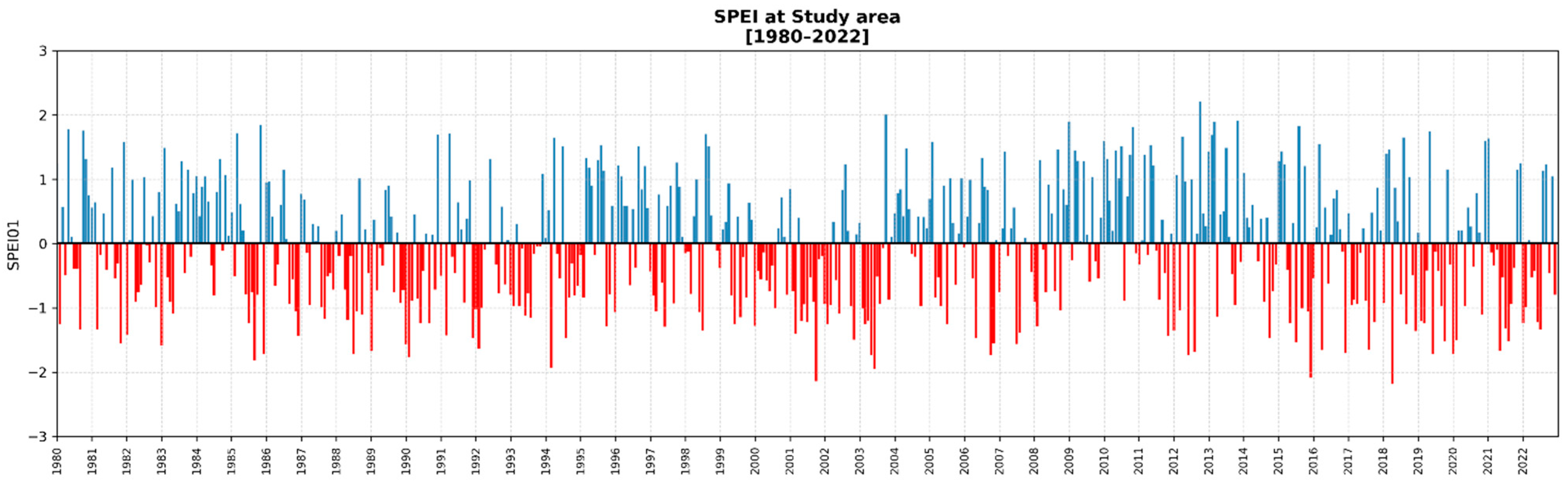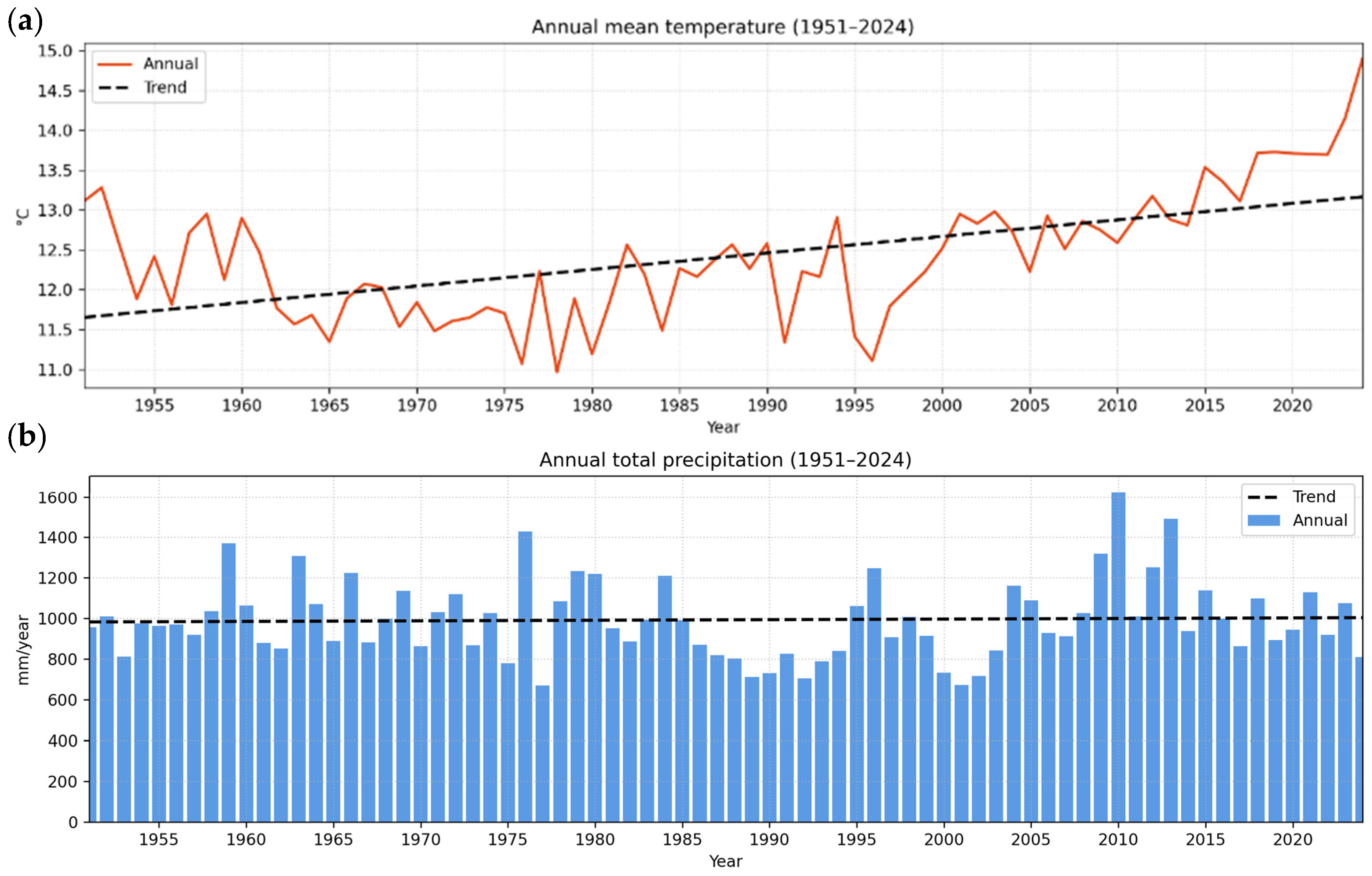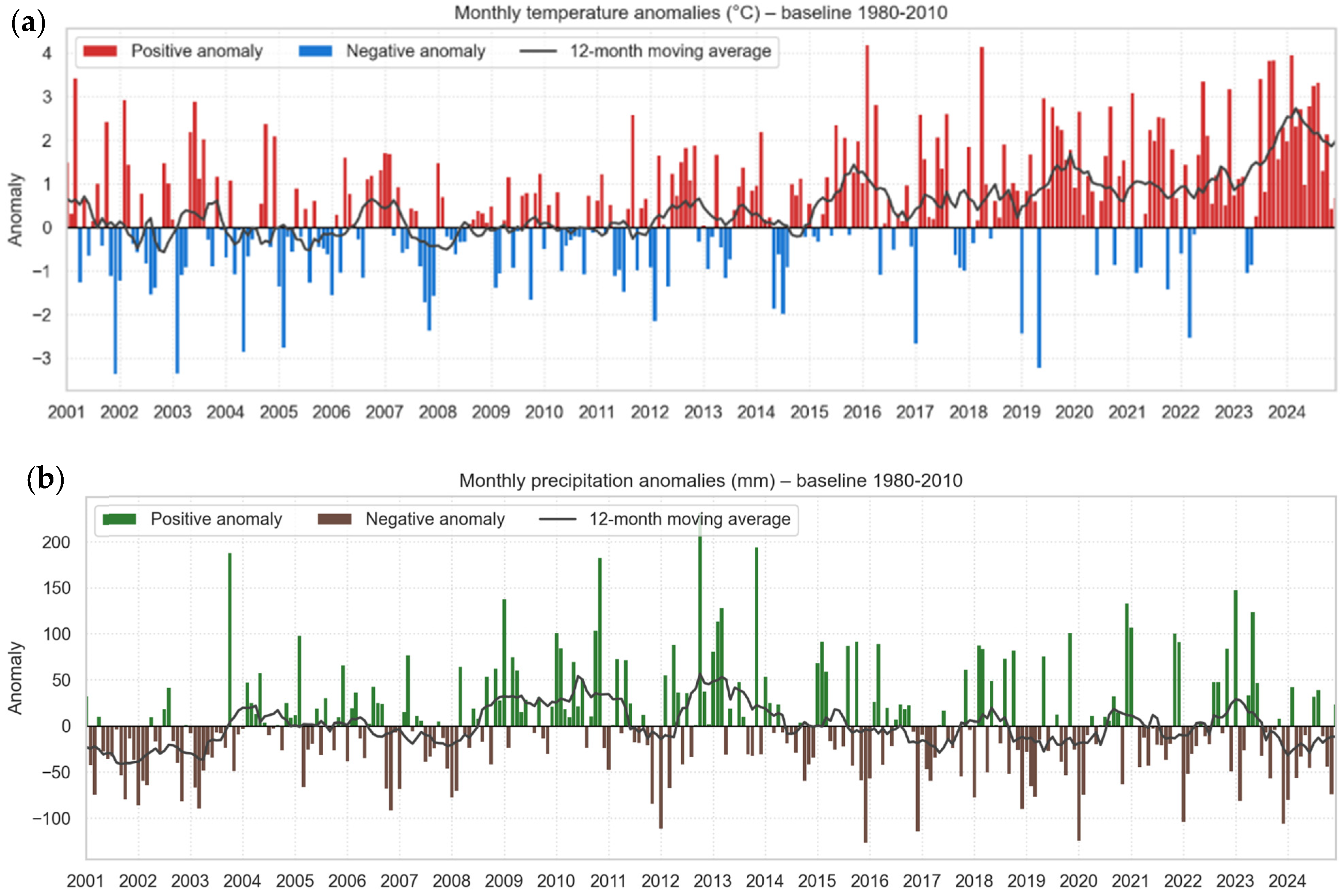 Figure 4). The climatic year is characterized by cool and relatively wet winters, a sharp reduction in rainfall from June to September, and a dry summer peak in July–August, where precipitation reached its minimum (≈20–35 mm month