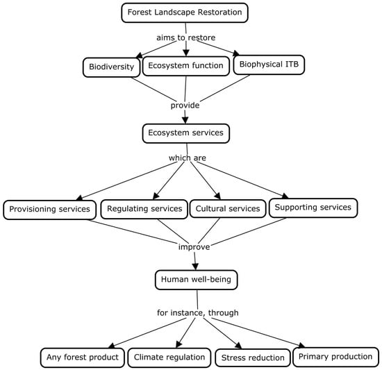 Figure 1. Conceptual map linking FLR to the concept of ESs: adapted from ref. [13] regarding the pyramid of human well-being that depends on natural capital. Links between concepts are expressed by the words on the arrows. ITB: Interaction through the biosphere.