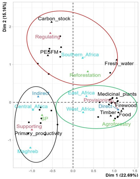 Figure 4. Relationship between different studies and the modalities of the variables “Ecosystem service categories,” “Forest restoration modality,” “Subregion in Africa,” “Use value” PESFM = Prevention of Erosion and Soil Fertility Maintenance. The modalities are colored according to their variables. Studies (individuals) are represented by black dots. Each circle groups together different individuals (studies) with the variables that characterize the group. The black circle defines group 1, the red color defines group 2, and the green circle corresponds to group 3.