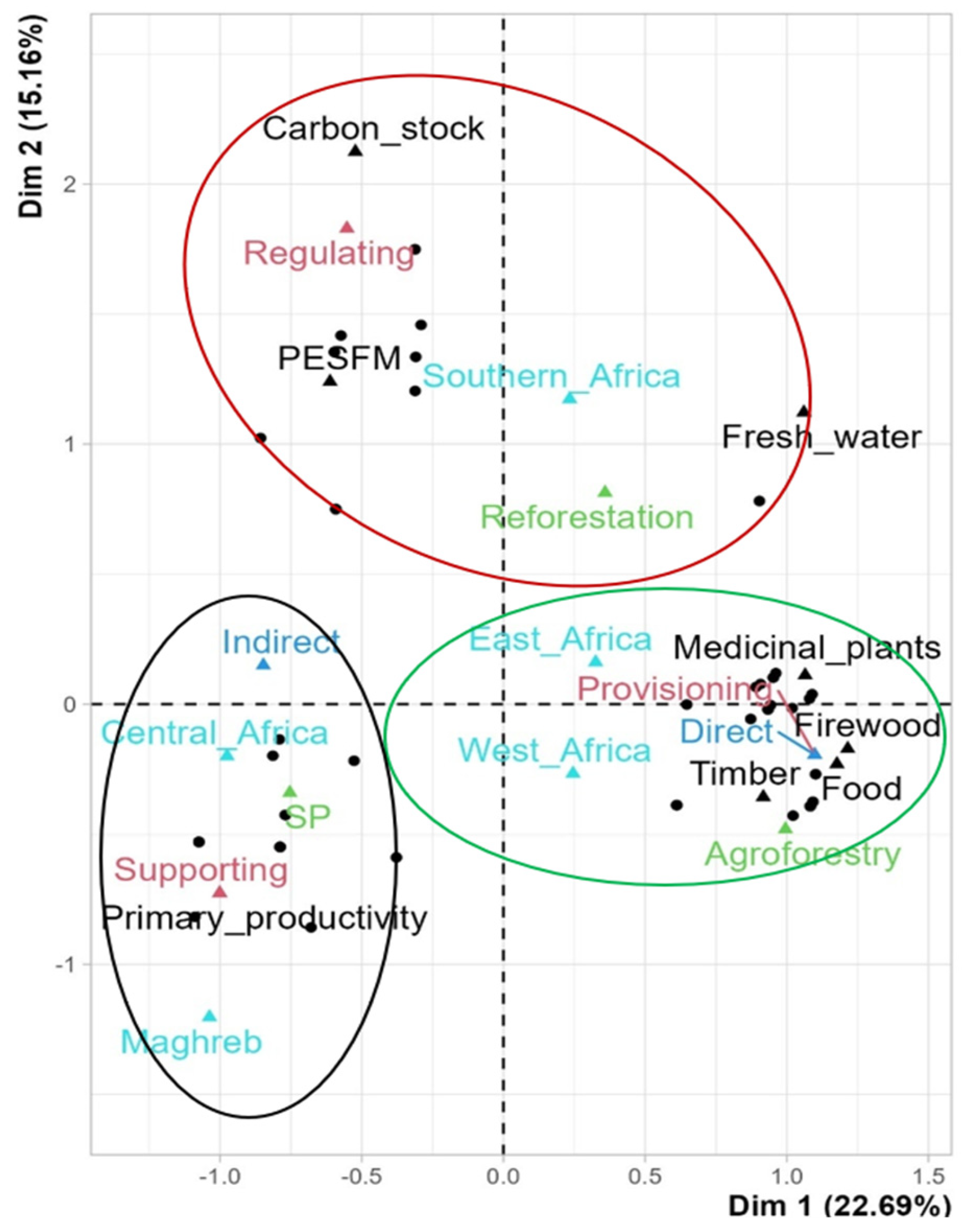 | III.1. Maintenance of primary productivity | Savannah protection Agroforestry Reforestation | Protection and conservation | Indirect use | Congo, Ghana, CAR, DRC, Nigéria, Senegal, Burundi, Burkina Faso, Algeria, Morocco, Ethiopia, Zambia, South Africa, Tanzania | [28,43,50,54,58,59,60,61,62,63,64,65,66,67,68,69,70,71,72,73,74,75,76] |