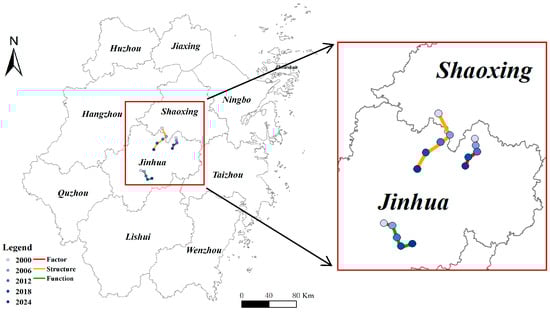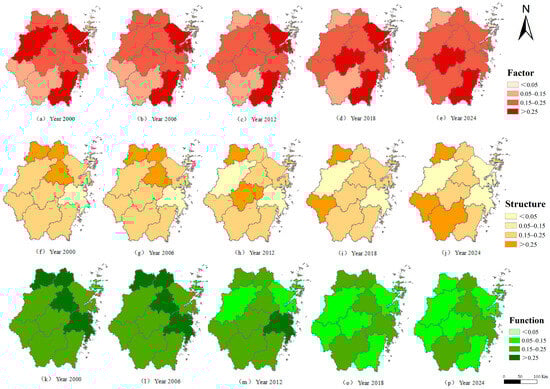 The spatial distribution of CLUTI and its factor, structure, and function components at the prefecture-level city scale is presented in Figure 4. Three color schemes are used to illustrate the spatial patterns of the framework components across the five observation years. The factor and structure components exhibited broadly similar spatial patterns, characterized by relatively higher values in northern Zhejiang, and lower values in central and southern regions during the early 2000s. Cities including Huzhou, Jiaxing, Hangzhou, Shaoxing, and Ningbo recorded comparatively higher scores in both components at the beginning of the study period. Over time, the scores of these cities declined to varying degrees, while increases were observed in cities such as Jinhua, Quzhou, and Lishui. The function component displayed a distinct temporal–spatial trajectory. After reaching higher values around 2006, the overall functional scores declined in subsequent periods. This pattern is consistent with the temporal variation in the CLUTI reported in Section 3.1.