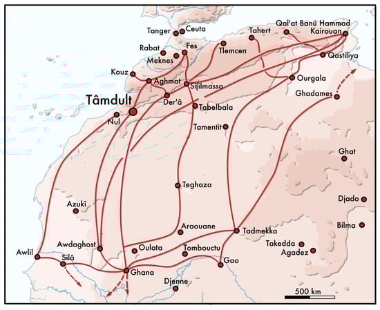 - Rosenberger, B. Tāmdult, cité minière et caravanière présaharienne (IXe–XIVe siècle). Hespéris-Tamuda 1970, XI, 103–139. [Google Scholar]