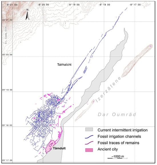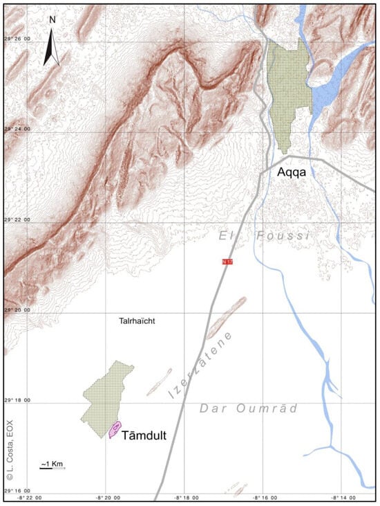 We extended our observations across a trapezoidal area of around 200 km2, running parallel to the Jebel Bani and the isoclinal ridges of Izerzatene, bounded to the north-east by the fūm and the still-productive oasis of Aqqa, and to the south-west by a line located two kilometres downstream from the site identified as the abandoned medieval town of Tāmdult. It should be noted that the term fūm (in its original sense of ‘mouth’) is deeply ingrained in the toponymy of the Anti-Atlas because it refers to a geomorphological feature conducive to the exploitation of the aquifer. Specifically, it denotes the point where a wadi valley, deeply incised in the mountains, opens onto the plain; here, the configuration of the underlying geological strata creates a threshold that forces the aquifer to rise, producing resurgences [32].