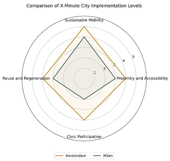 In summary, the findings underscore that the effectiveness of the X-Minute City depends on the combination of infrastructure, governance, and civic participation. Amsterdam represents an advanced example of systemic integration between services, sustainable mobility, reuse of urban spaces, and social inclusion, while Milan demonstrates how a bottom-up and experimental approach can foster innovation and resilience, while requiring more coherent strategies. Table 5 details the operational characteristics of each city, while Figure 4 a radar diagram based on qualitative scores derived from the five-point implementation scale and should be interpreted as an illustrative comparison, not as an exact statistical measurement.