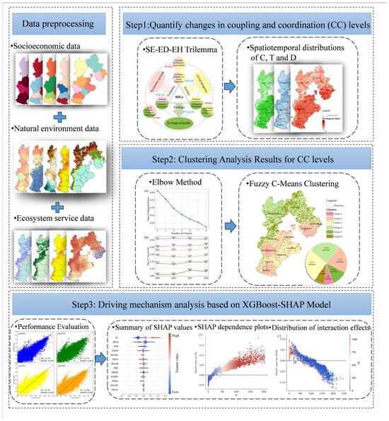 The research framework includes data preprocessing, quantification of coupling and coordination (CC) levels, clustering analysis, and driving mechanism analysis based on the XGBoost-SHAP model (Figure 2). First, multi-source heterogeneous data, including socioeconomic, natural environment, and ecosystem service data, were integrated and standardized to provide a solid foundation for subsequent analysis. Second, the quantification of CC levels was carried out using the SE-ED-EH trilemma framework, analyzing the coupling and coordination of social equity, economic development, and ecosystem health, and examining the spatiotemporal variations of the coupling degree (C), coordination degree (T), and CC level (D). The third step involved clustering analysis, where the elbow method and fuzzy C-means clustering were applied to identify regional differences in CC levels. Finally, the driving mechanism analysis, based on the XGBoost-SHAP model, evaluated the influence of various driving factors, analyzed the distribution of SHAP values, and explored the interactions between these factors using SHAP dependence plots and interaction effect distributions. These steps comprehensively reveal the factors influencing regional coordinated development and provide interpretable analytical results.