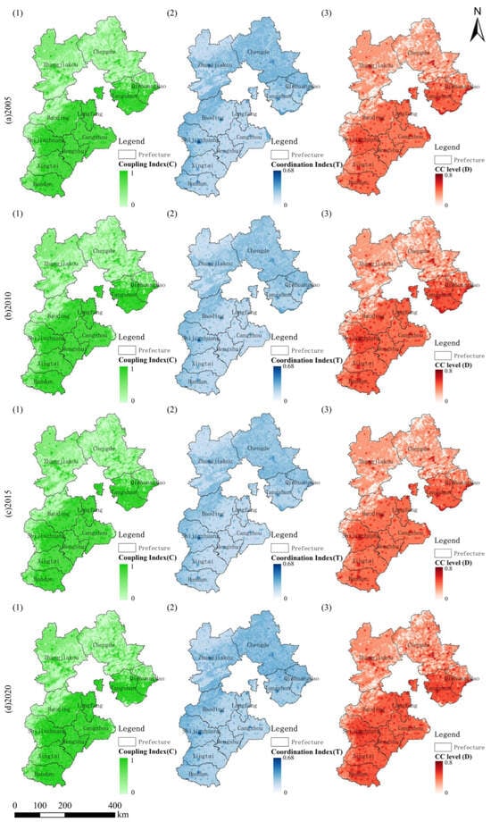 As shown in Figure 3(1), the C-value exhibits substantial spatial differentiation across Hebei Province. The highest C-values are observed in major urban centers, reflecting the strong coupling driven by intensive socioeconomic activities and enhanced ecological governance under rapid urbanization. Over time, from 2005 to 2020, a slight increase in C-values can be observed in these urban centers, suggesting an ongoing strengthening of coupling due to continuous urban expansion and socioeconomic development. In contrast, northwestern mountainous regions display relatively low C-values, which may be attributed to limited economic activity, weaker infrastructure conditions, and comparatively stable ecological systems.