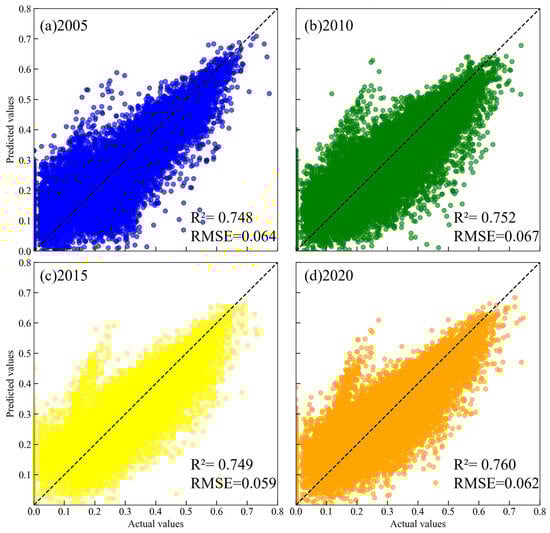 To investigate the multifactor driving mechanisms influencing CC levels within the SE–ED–EH sustainability trilemma in Hebei Province, an XGBoost regression model was constructed, and its predictive performance was evaluated using the test dataset (Figure 5). The R2 values for all four study periods (2005–2020) exceed 0.74, and the RMSE values are all below 0.067, indicating high model accuracy and robustness. These results confirm that the model effectively captures the relationships between CC levels (D) and multiple influencing factors, providing a reliable basis for subsequent SHAP-based interpretation.