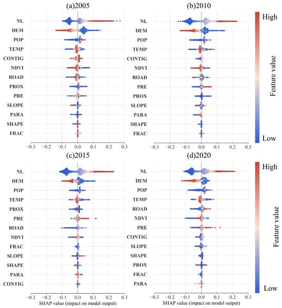 The SHAP method was applied to interpret the XGBoost regression results for the four study periods (2005–2020), enabling a quantitative assessment of the dynamic influence and contribution intensity of each factor on changes in CC levels (D) within the SE–ED–EH trilemma (Figure 6). According to the SHAP importance ranking, NL, DEM, POP, and TEMP consistently occupy the top positions across all periods, indicating that human activity intensity and natural environmental conditions are the primary determinants of CC variations. NL and POP exhibit positive correlations with D-values, reflecting the prominent role of anthropogenic factors in improving coordinated development, while DEM shows a negative correlation with D, suggesting a constraining effect associated with high-altitude terrain. The influence of TEMP demonstrates temporal and spatial variability with no consistent directional trend, indicating that temperature or climate change contributes very little to short-term CC variations. Over time, the inhibitory effect of DEM gradually weakens, whereas the influence of POP first declines and subsequently increases, becoming more pronounced after 2015. The contributions of other factors remain relatively limited and fluctuate substantially across periods.