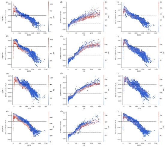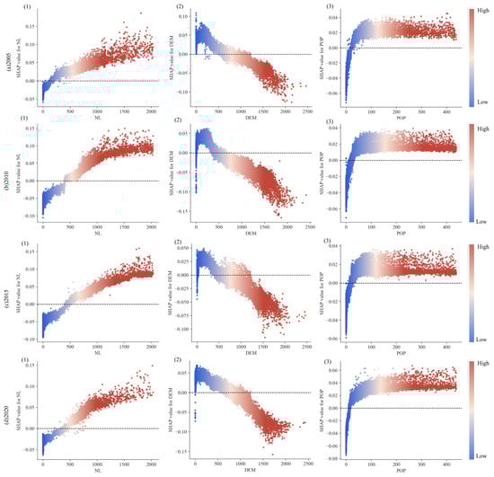 To further examine the nonlinear relationships and threshold responses between key drivers and changes in CC levels, this study selected the three most important factors based on SHAP importance rankings and constructed dependency plots for the four periods from 2005 to 2020 (Figure 7). The results reveal pronounced nonlinear effects and clear threshold characteristics for all three variables. For NL, the overall effect is positive. In 2005, the dominant threshold interval was approximately 250–1500 nits. Values below 250 nits exhibited a negative effect, reflecting the issues of insufficient economic activities and lack of social services in areas with low light intensity. Between 250 and 1500 nits, the positive effect was significant, indicating that moderate NL is beneficial for promoting sustainable urban development. Beyond 1500 nits, the marginal effect gradually weakened, suggesting that excessive light intensity, while contributing to socioeconomic development, brings some environmental burdens such as habitat disruption and light pollution. After 2010, the dominant threshold band shifted to 500–1500 nits. For DEM, the overall effect was negative, though threshold values varied across periods (approximately 1200 m, 1000 m, 1250 m, and 1250 m, respectively), reflecting the modulation of terrain constraints by human accessibility and resource utilization intensity, highlighting the important role of terrain in promoting or constraining regional development. Below the threshold level, DEM exhibited a positive association with D-values, whereas above the threshold, DEM exerted a strong inhibitory influence, reflecting the limiting role of terrain constraints under varying conditions of human accessibility and resource utilization intensity. For POP, the threshold remained relatively stable at approximately 40 persons/km2. Values below this threshold produced negative effects, suggesting that areas with low population density lack sufficient socioeconomic activities and resource development, which affects the sustainable development of the socioeconomic conditions. By contrast, values above 100 persons/km2 displayed diminishing marginal benefits, indicating a saturation effect with respect to population-driven development gains.
