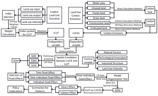 This study aims to break through the explicit constraints of land use type conversion, with Hebei Province as the research area and county-level units as the basic analysis scale. It focuses on investigating the spatial correlation mechanism between ILUT and carbon emissions. For carbon emission accounting, the carbon emission coefficient method can be adopted to quantify direct land-based emissions from cropland, woodland and other typical land types. Meanwhile, the nighttime light inversion method is applicable to estimate indirect carbon emissions from construction land, thus constructing a county-scale calculation system for LUCEs. Departing from the traditional composite index for ILUT evaluation, indicators are selected from the three dimensions of “input–output–intensity” and then standardized. Weights of these indicators are assigned via the entropy-weighted TOPSIS method, followed by weighted summation to derive the comprehensive index of ILUT. In the spatial analysis stage, the global Moran’s I index is used to test the spatial correlation between ILUT and carbon emissions at the county level, which verifies the applicability of spatial econometric models for this research. The Lagrange multiplier (LM) test is further employed to preliminarily screen feasible spatial econometric approaches. Subsequently, the Hausman test is conducted to determine the choice between fixed and random effects. Finally, the likelihood ratio (LR) test and Wald test are utilized to judge whether the model degenerates and identify the optimal model specification. The technical roadmap of this study is illustrated in Figure 2.