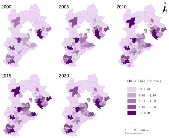 LUCEs’ spatial distribution maps in Hebei Province for five years, 2000, 2005, 2010, 2015, and 2020, were produced through ArcGIS 10.8.2 (Figure 4). LUCEs of counties in Hebei Province were categorized into five levels: low carbon emission zone (≤0.60 million tons), medium-low carbon emission zone (0.61–1.10 million tons), medium carbon emission zone (1.11–1.80 million tons), high carbon emission zone (1.81–3.00 million tons), and ultra-high carbon emission zone (>3.00 million tons). Significant disparities in LUCEs of counties were observed across Hebei Province from 2000 to 2020, with higher emissions in the southeast and lower emissions in the northwest. Elevated carbon emission zones were concentrated within the main urban districts of various cities in Hebei Province. The quantity saw a sharp reduction.