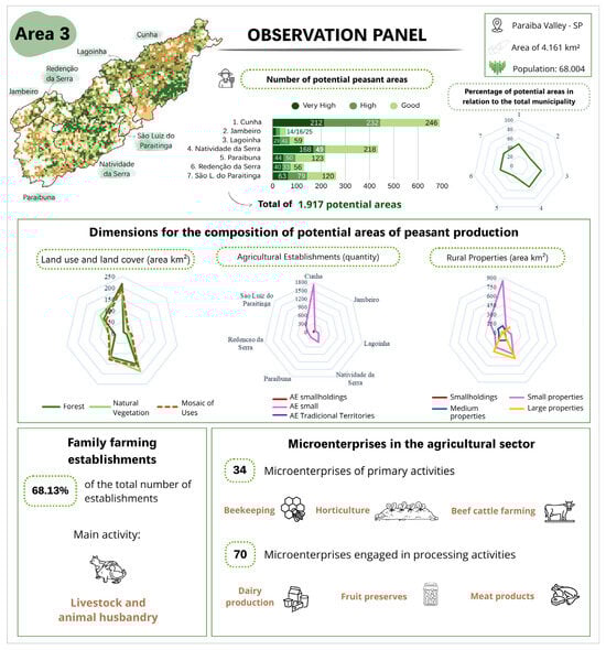 To guide these analyses of the area with potential for primary peasant agri-food production, an Observation Panel was adopted. This tool is designed to explore complex processes and phenomena through an integrative approach. It is composed of a set of graphical representations—including images, diagrams, photographs, maps as and tabular formats [49,50]. Figure 8 shows the Observation Panel with seven sets of elements described below: