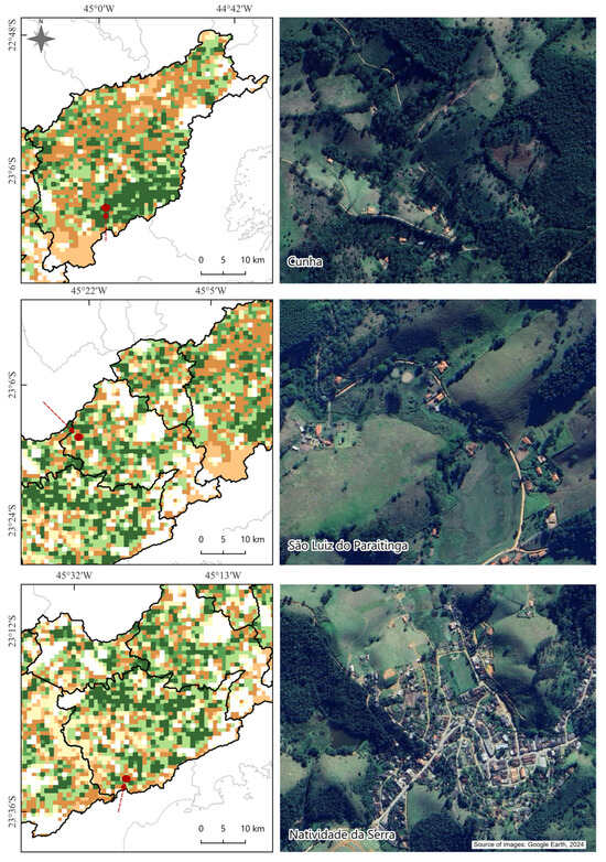 The historical trajectory of Natividade da Serra and Redenção da Serra also includes episodes of forced displacement of rural producers—particularly during the 1970s, when the construction of dams in Paraibuna, São Luiz do Paraitinga, Santa Branca, and Jaguari led to the flooding of rural properties. As a consequence, many producers migrated to urban centers, while others redirected their activities toward large-scale eucalyptus cultivation and livestock farming [51,52,53].