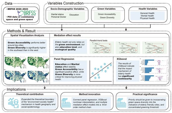 Four complementary analytical methods are employed. Spatial visualization is used to examine evolving patterns of green accessibility and diversity in relation to regional health disparities. Mediation models are employed to identify how psychological and social pathways link green space equity to health outcomes. Panel regression tests the temporal stability of green space effects and differentiates the contributions of accessibility versus diversity over time. Finally, XGBoost models capture nonlinear relationships and identify threshold points at which green space equity produces significantly stronger health benefits. These methods provide a holistic understanding of how green space equity affects older adults’ health across spatial, temporal, and health dimensions.