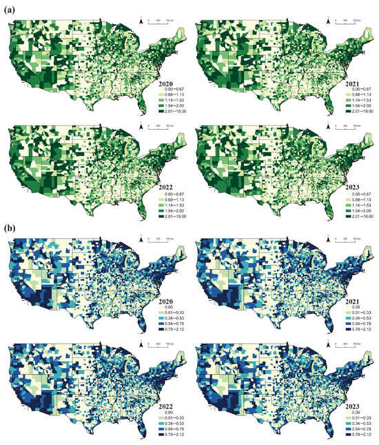 Green diversity shows stronger spatial differentiation than accessibility, capturing regional variation in green space structure and quality in terms of the compositional richness and balance of urban green space types. High diversity is concentrated in the southeastern and northeastern United States, with deep blue shades across much of the eastern and southeastern counties, especially from Georgia to North Carolina. These regions typically contain a mix of parks, woodlands, wetlands, and open spaces, indicating a more balanced and heterogeneous green space structure. In contrast, the Midwestern and much of the western regions exhibit widespread low diversity, particularly in the Great Plains and western rural areas, where green spaces are often dominated by single-purpose land uses such as farmland or grassland. From 2020 to 2023, green diversity demonstrates a slow but steady increase. Expansion of high-diversity areas is most evident in the southern states, including Alabama, Mississippi, Georgia, and Louisiana, suggesting gradual improvements in green space composition and quality over time.