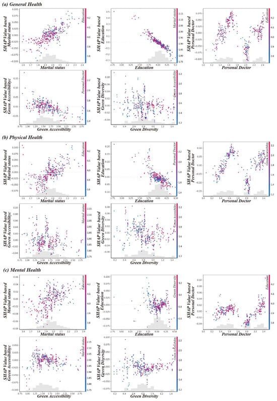 XGBoost analysis dependence plots. (a) General health, (b) mental health, (c) physical health.