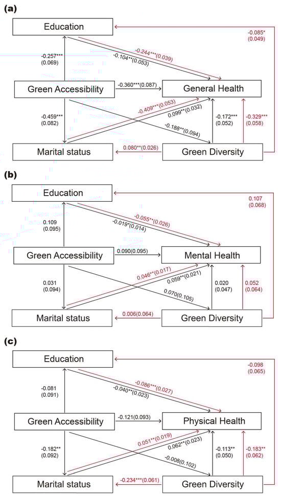 To identify the intrinsic mechanisms through which green space equity affects the health of older adults, this study introduces a mediation model to test whether green accessibility and green diversity indirectly influence the health outcomes (general health, mental health, and physical health) through socio-demographic variables (such as Marital status and Education). Unlike traditional panel regression, mediation analysis distinguishes direct from indirect effects, providing a clearer account of potential pathways linking the green environment to health. The mediation model comprises three basic regression equations: