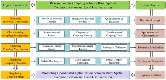 In summary, against the backdrop of the transition from rural “productivism” to “post-productivism” and multifunctional development stages, research on the coupling between rural spatial commodification and land use transition has emerged as a cutting-edge interdisciplinary frontier in rural geography and land system science. Looking ahead, future research should further focus on key themes such as the coupling mechanisms, evolutionary simulation, and optimization regulation of rural spatial commodification and land use transition. Following the logical progression of “elucidating theoretical connotations, characterizing coupling relationships, analyzing coupling mechanisms, simulating coupling processes, and regulating coupling states”, a comprehensive coupling framework integrating rural spatial commodification and land use transition should be systematically constructed (Figure 1).