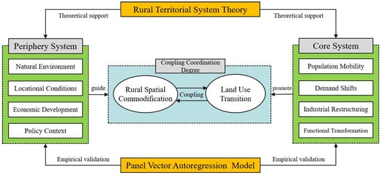 The coupling relationship between rural spatial commodification and land use transition is influenced by a multitude of factors, including natural conditions and socioeconomic dynamics. Consequently, it manifests in diverse coupling patterns across different spatiotemporal scales and regional typologies. The theory of rural territorial systems provides crucial theoretical support for elucidating the formation mechanisms underlying this coupling relationship. It posits that a rural territorial system is a spatially organized rural entity formed through the interaction and integration of human, economic, resource, and environmental elements. It possesses distinct structures, functions, and interregional linkages, comprising two core subsystems: the periphery and the core. The periphery subsystem consists of external interventions and influences, such as the natural environment, external policies, and institutional frameworks, which exert pressures and inputs on the core. The core subsystem encompasses internal drivers of rural development, including rural population, land, and industries. These intrinsic factors interact dynamically with the periphery, co-shaping the evolutionary pathways and functional characteristics of rural territories. The continuous interaction and mutual adaptation between the periphery and the core collectively govern the systemic evolution and differentiation of rural territorial systems.