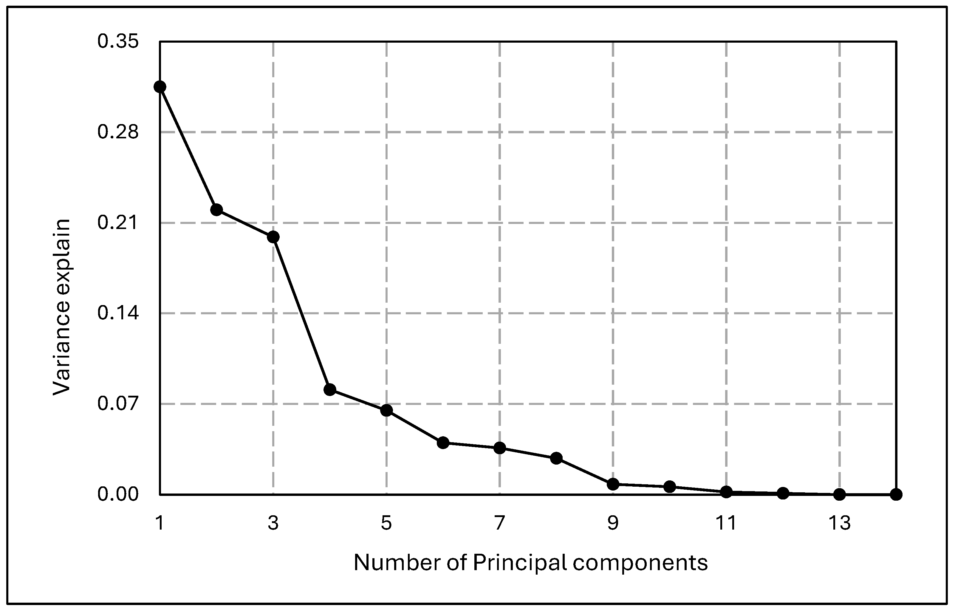 | Eigen value | 4.41 | 3.08 | 2.78 | 1.13 | 0.91 | 0.56 | 0.50 | 0.39 | 0.11 | 0.08 | 0.03 | 0.01 | 0.00 | 0.00 |