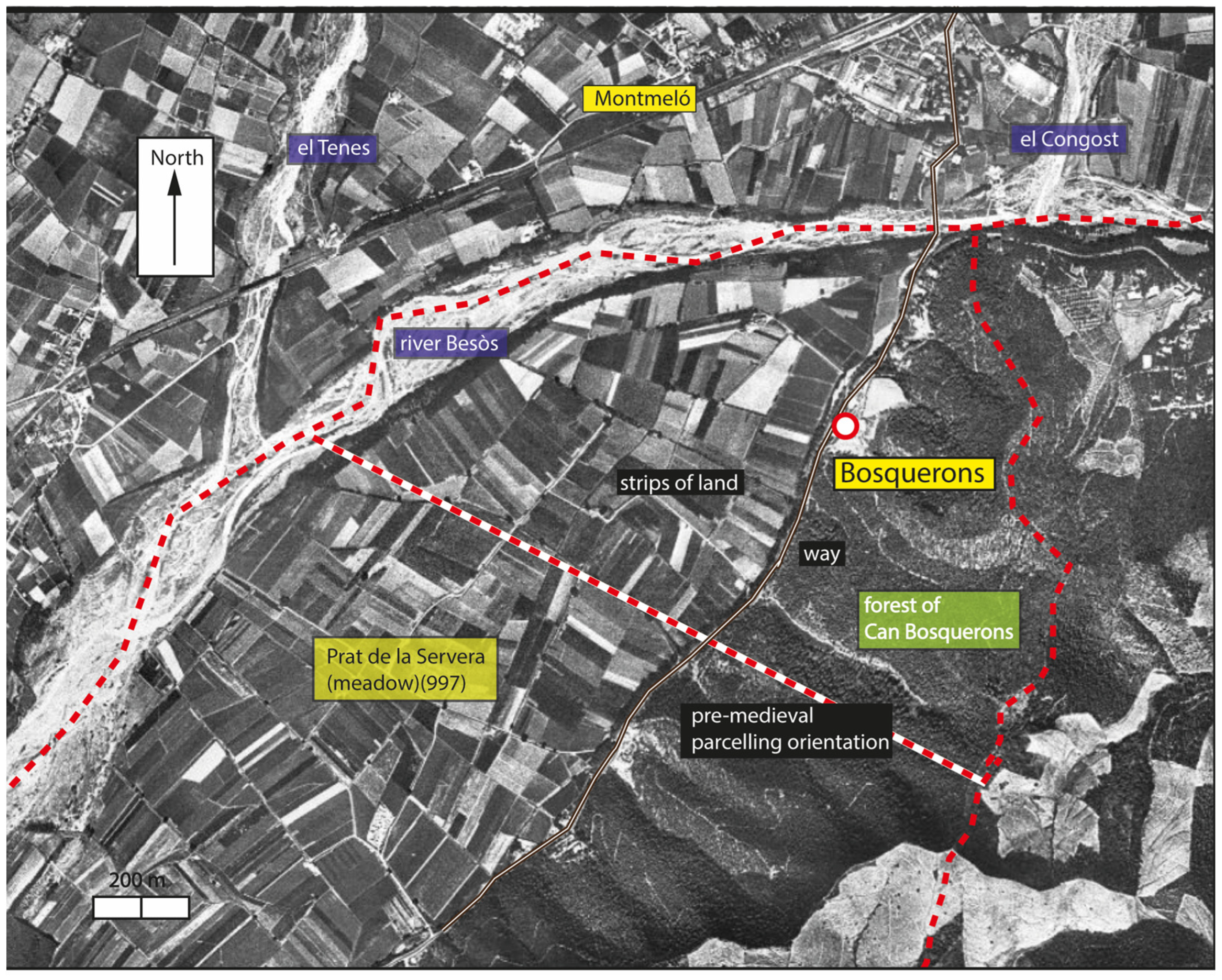 Aerial photographs reveal that all these sites consisted of braided terraces. In Vilanova, at least thirty-five terraces were visible in 1956; there were virtually no extensive plots (the largest terrace covered 0.2 ha). The total cultivated area was approximately 5 ha; the remainder was likely forested land. Indeed, in 923, the document mentions