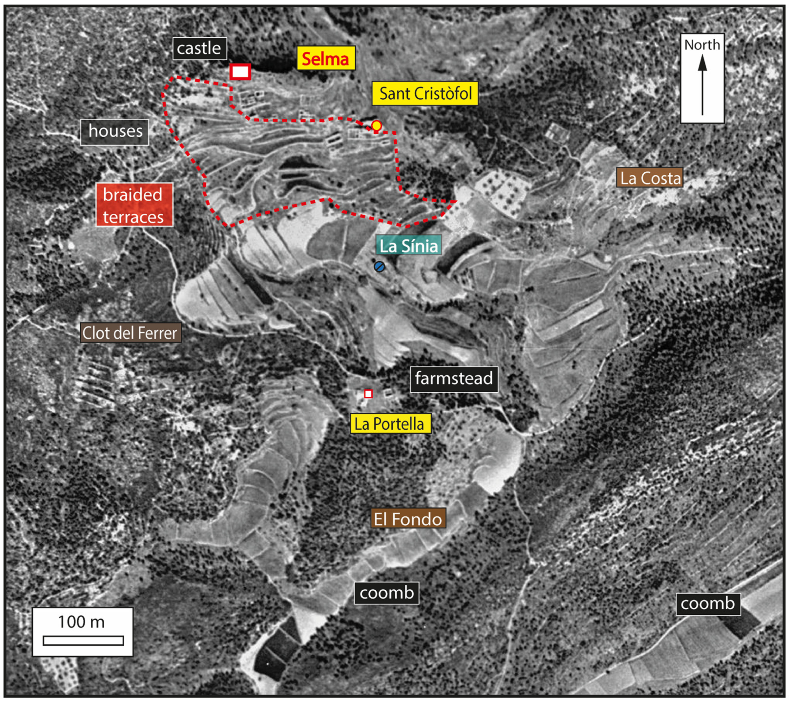 29] (pp. 144–147). Aerial photography from 1956 shows a farmhouse with a series of braided terraces surrounding it, extending over slightly more than 5 ha. In the same municipality, at Can Quer (referred to as Mas Cuiàs in 1349), a farmhouse situated atop a hill, there is a predominance of braided terraces [