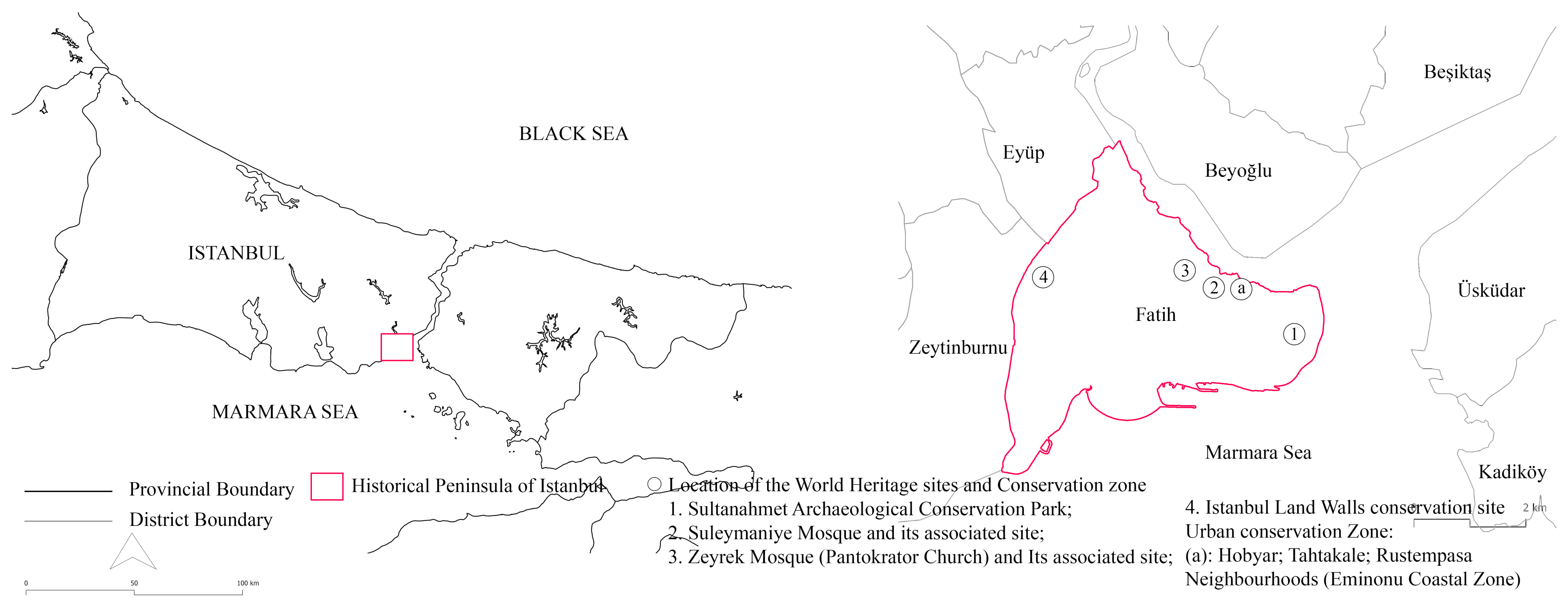 Figure 1 illustrates the study areas with the boundaries of the historical peninsula of Istanbul on the left and one inset map on the right, showing the locations of the World Heritage sites and urban conservation zone in its historical peninsula district.