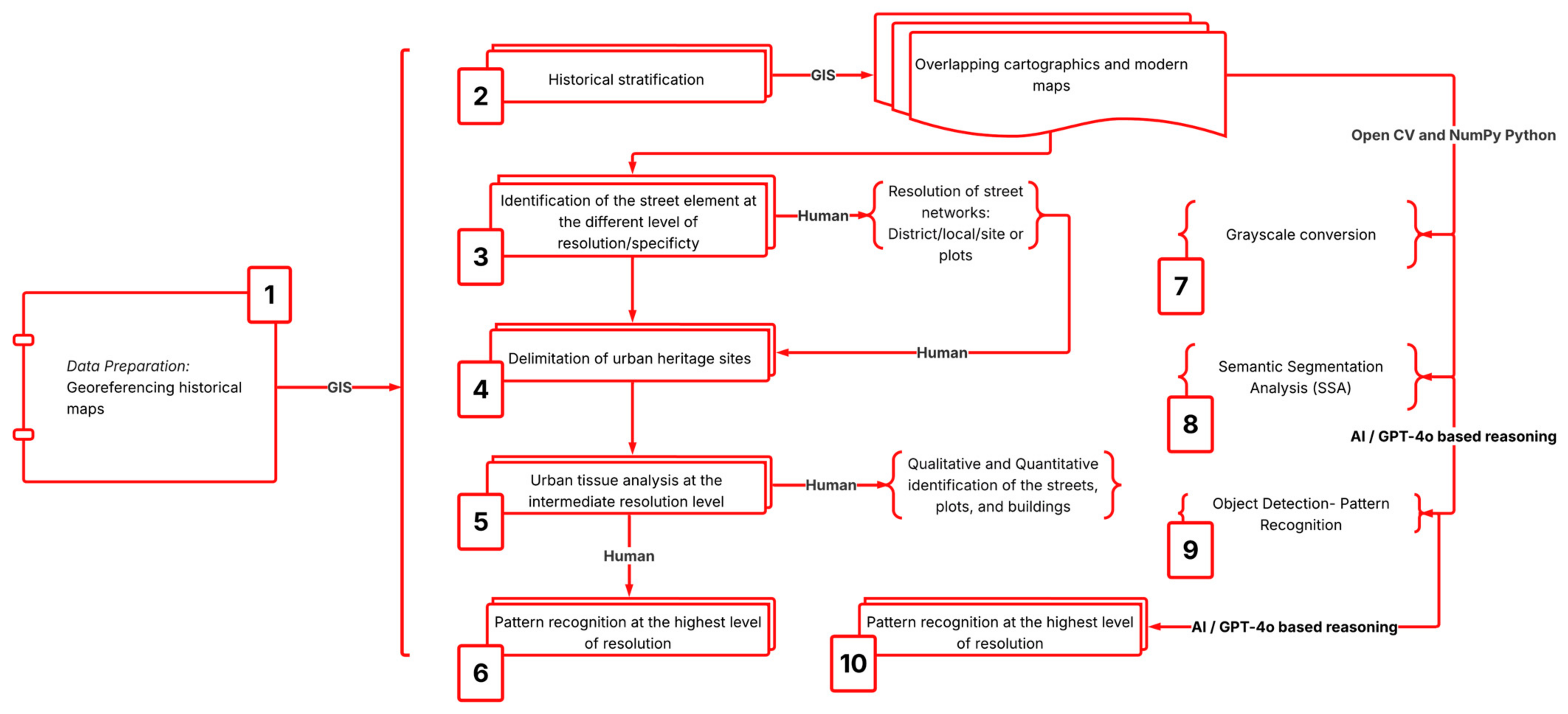 22], (i) we first look at the indicators of urban form at different levels of scale, seeking to identify the generative principles that give urban heritage sites a unique identity—a qualitative description of the types—and quantifying variables simultaneously; (ii) we then establish a model for pattern recognition or classification of types from maps by using models from deep learning to define where the patterns (spatial hierarchies of features) are truly adaptive and generative; and (iii) based on the results integrated with human intelligence and the CNNs model, we generate several prompts to AI for better reasoning in the process of pattern recognition, aiming to obtain GPT-4o’s assumptions to compare the results produced by humans and AI. This study aims to develop an integrated methodological framework that combines urban morphology with deep learning and artificial intelligence. The contribution of the AI here is its methodological novelty, while urban morphology faces limitations in processing large-scale and multi-temporal spatial datasets. In this framework, AI employs a reasoning and validation layer, rather than a replacement for urban morphological reasoning, enabling pattern recognition at different levels of resolution beyond human-based assessment. The core analytical structure remains grounded in established urban morphology theories, while deep learning and AI-based reasoning are used to extend the capacity of pattern recognition beyond human assessment. The research addresses the challenge of recognizing historically layered urban forms by linking human-led morphological reasoning with AI-based reasoning as a complementary analytical tool.
