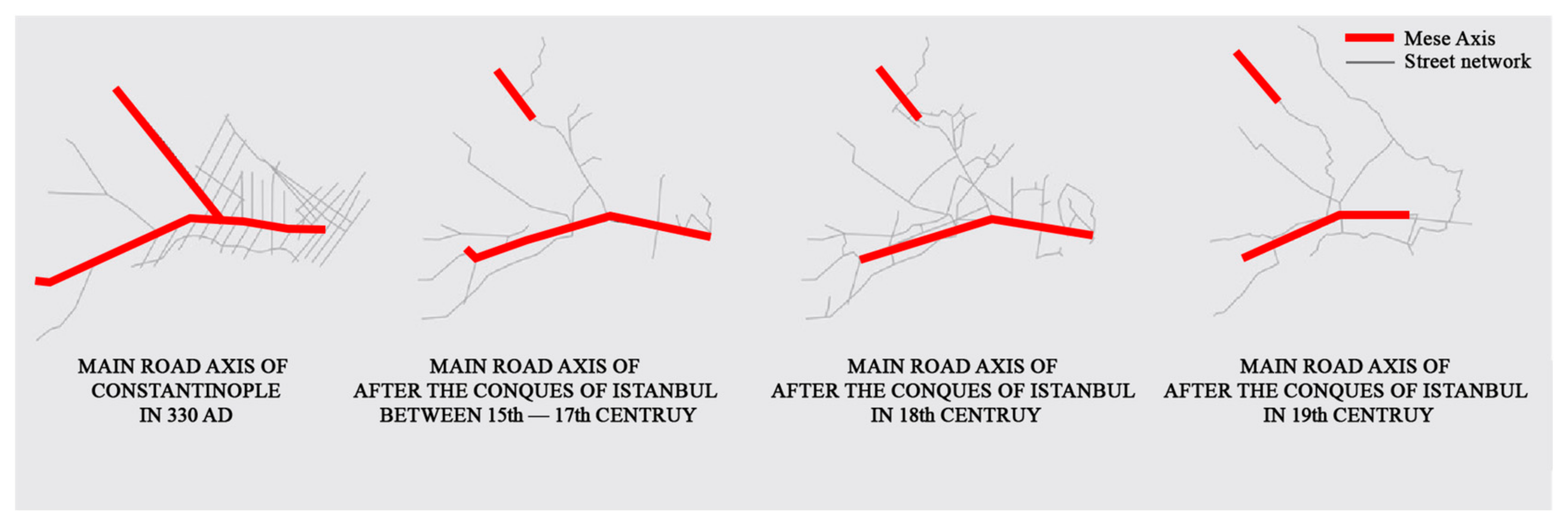 33]. The Roman-made “Mese” axis, which constitutes the spine of the city and was built by Constantine on the basis of connecting the seven hills of the city, determined the exact route of the city and remained the same throughout history.