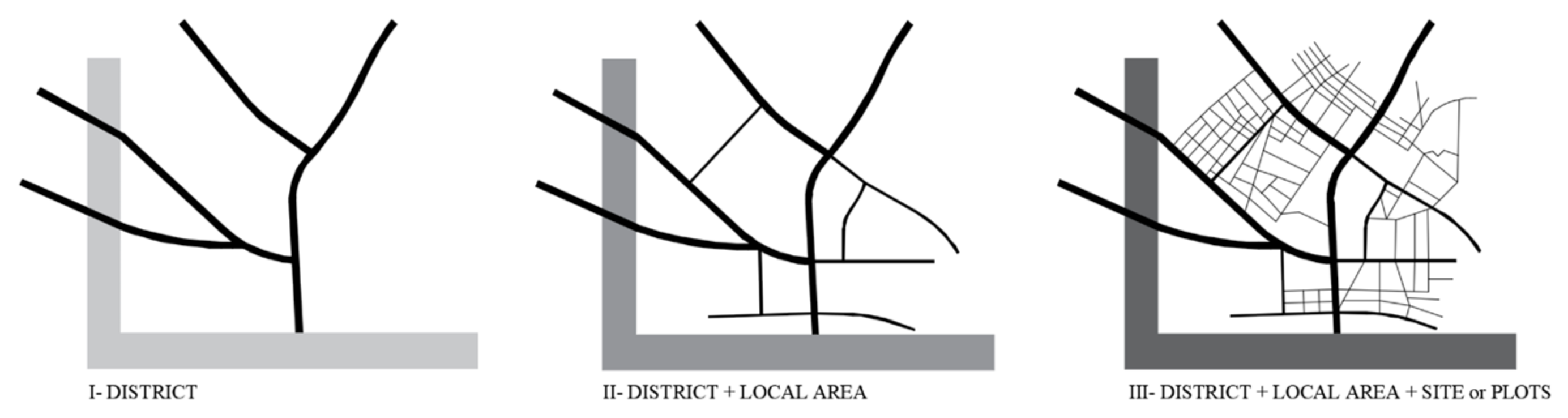 Figure 10 also demonstrates the typologies of streets, blocks, plots, and buildings that were identified at the highest levels of resolution.